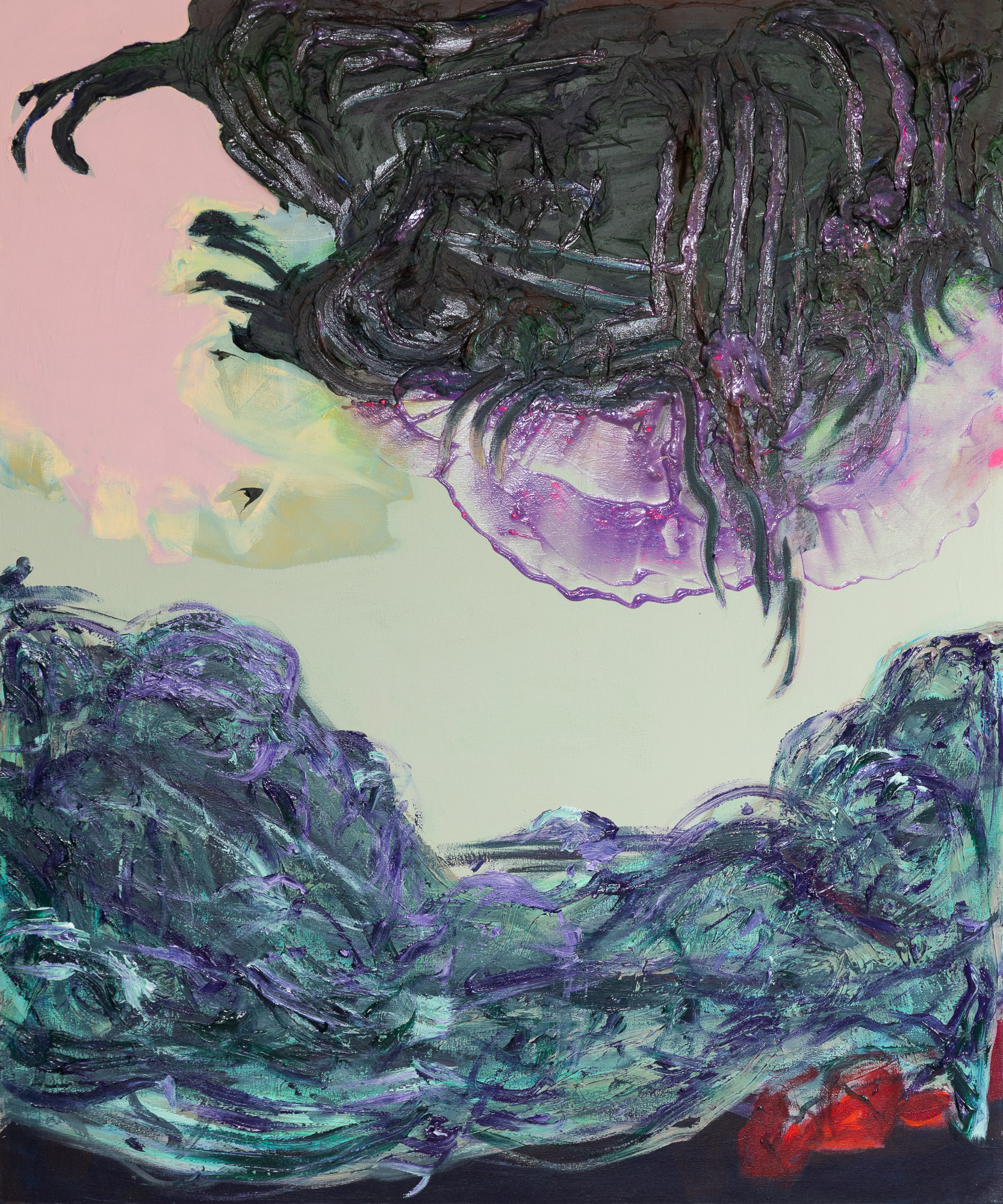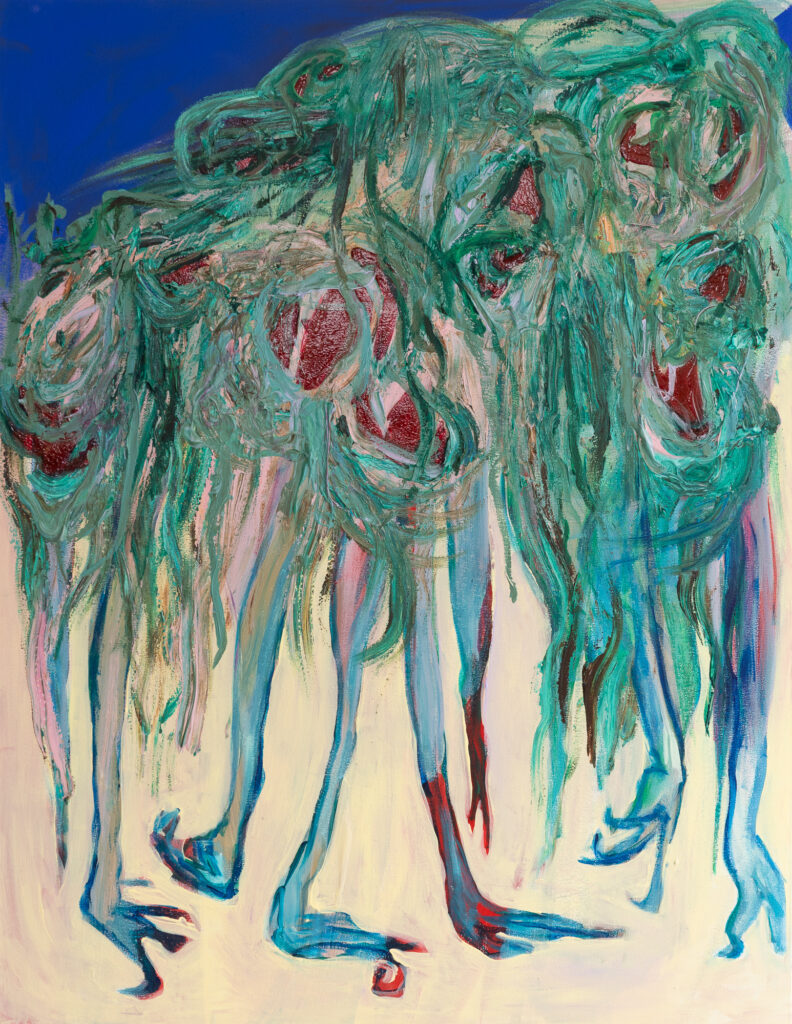 Kallio’s paintings exist in a state of unrest, like the air before a storm. Tipping Point moves along the edge where weather and emotion meet, exploring the moment when everything shifts—too early, too intensely. Human bodies in her works are pierced by forces of nature and raw feeling: the rain lashes, the emotion floods. Kallio’s expressive brushwork captures a disrupted rhythm where nothing feels quite right—not the weather, not the emotion, not the body.